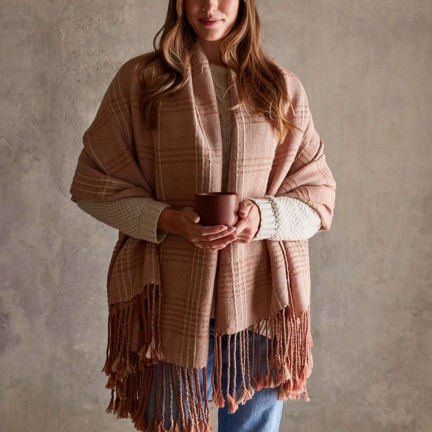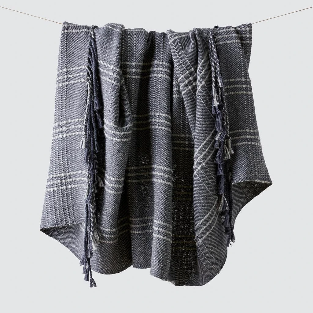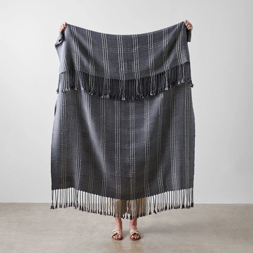 Cozy meets classic. A plain weave accented with large, raised lines, this stunning throw features a classic grid pattern that fits in any space. Available in stone blue or rich clay, each piece is finished with a hand-twisted fringe for a laid-back, boho look.