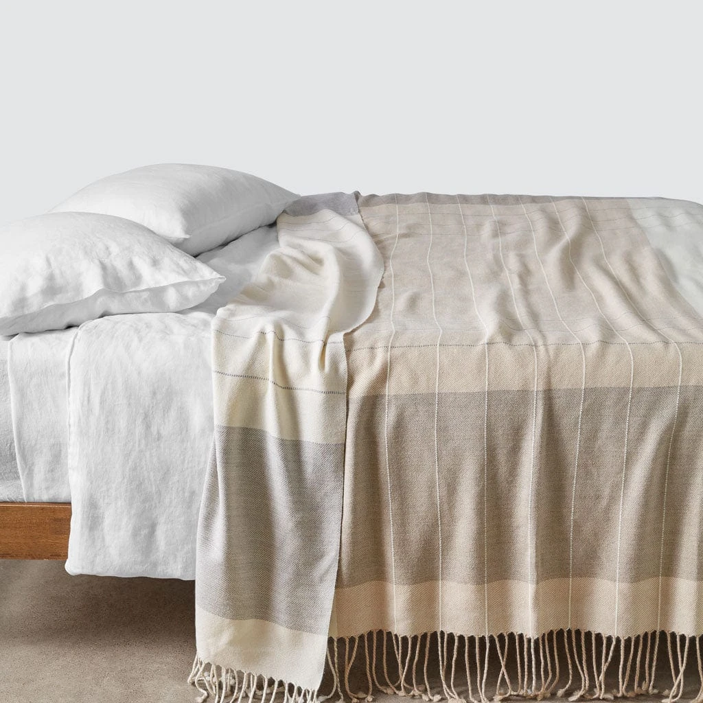 Warm, neutral tones. A modern grid design. Hand-knotted fringe. This throw blanket is pure artistry. Hand-loomed from the softest baby alpaca, it’s made for those stay-in-and-get-cozy days to come.