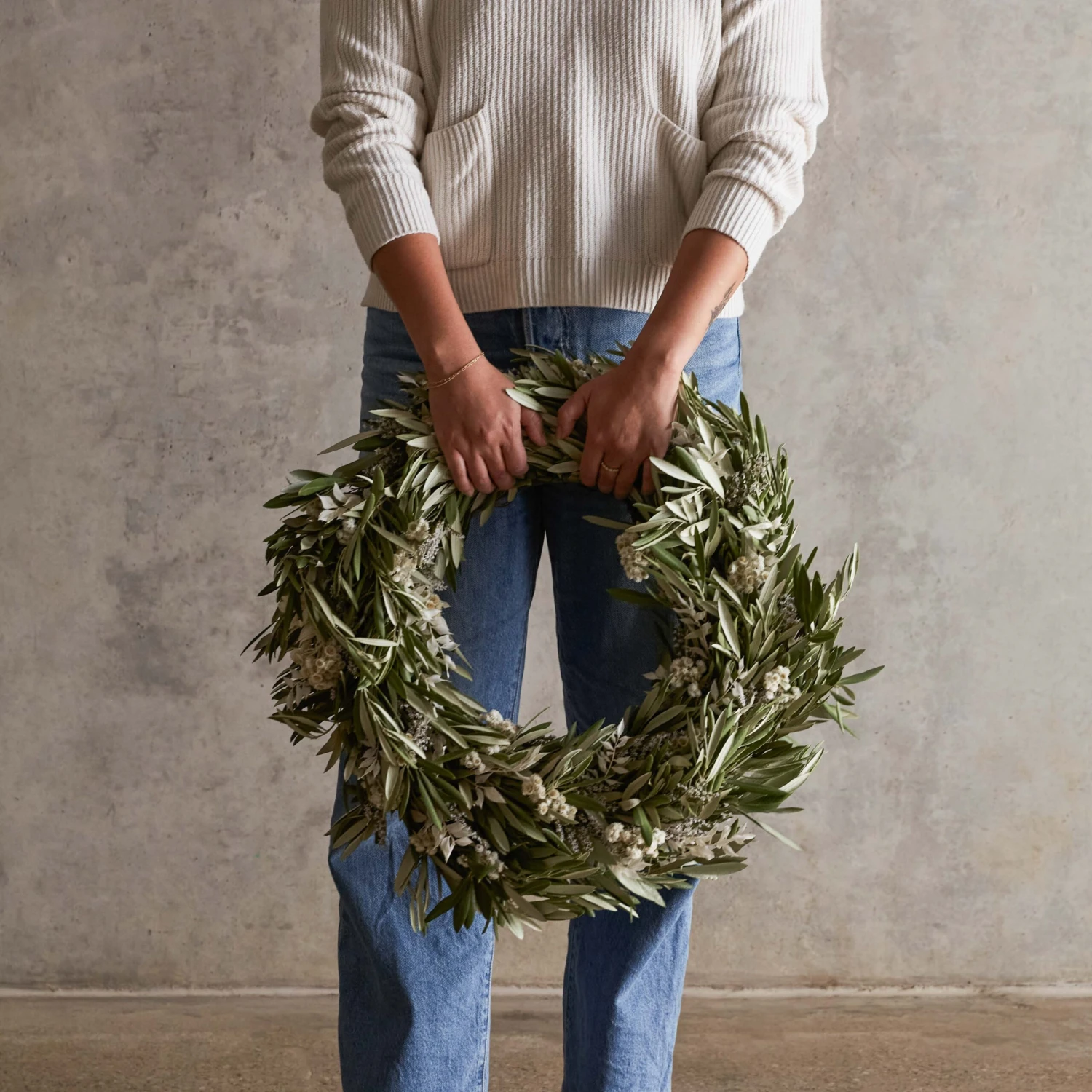 This wreath is made fresh with live olive braches and will dry out over the course of a few weeks. Soak in water to revive its appearance, or enjoy the natural look as it dries.