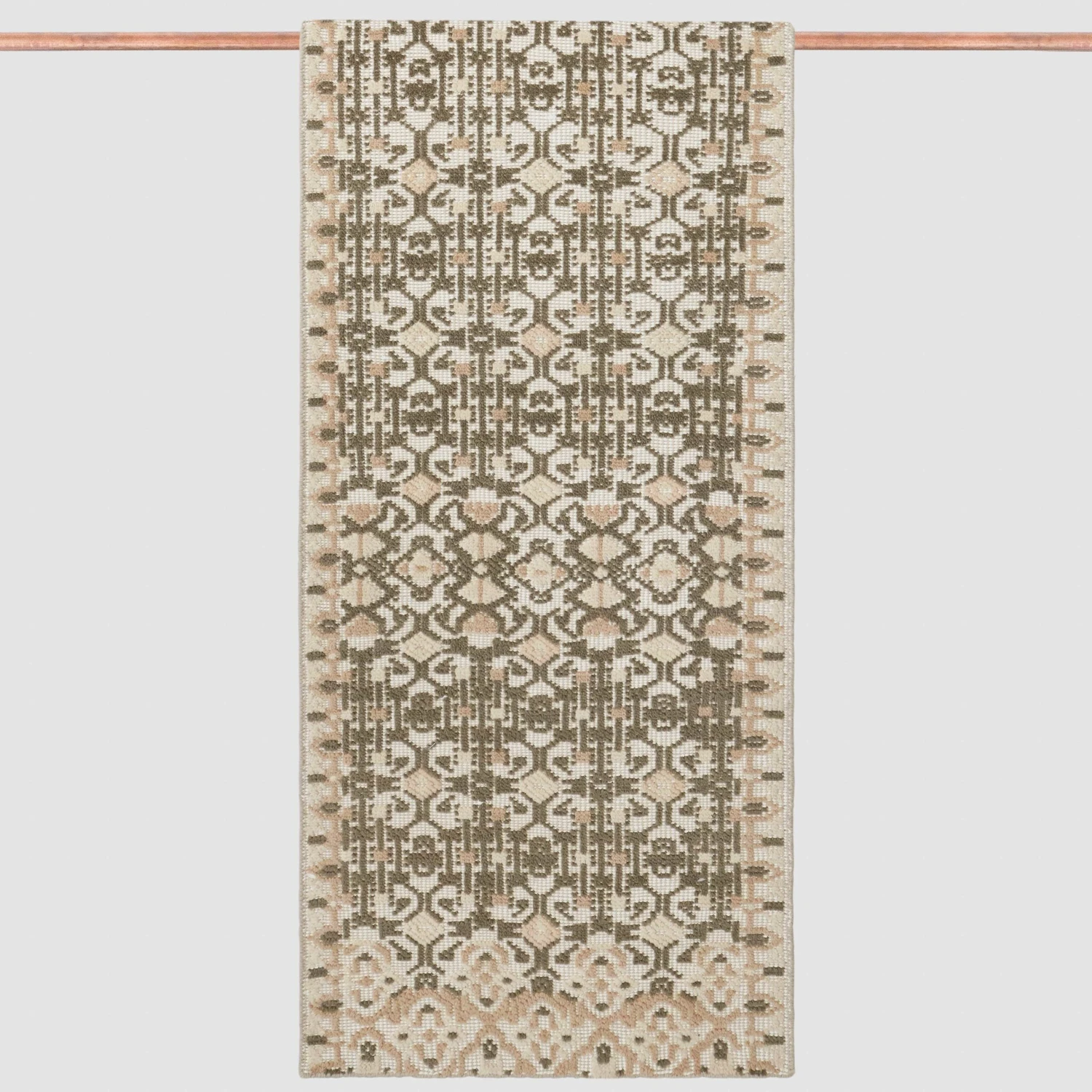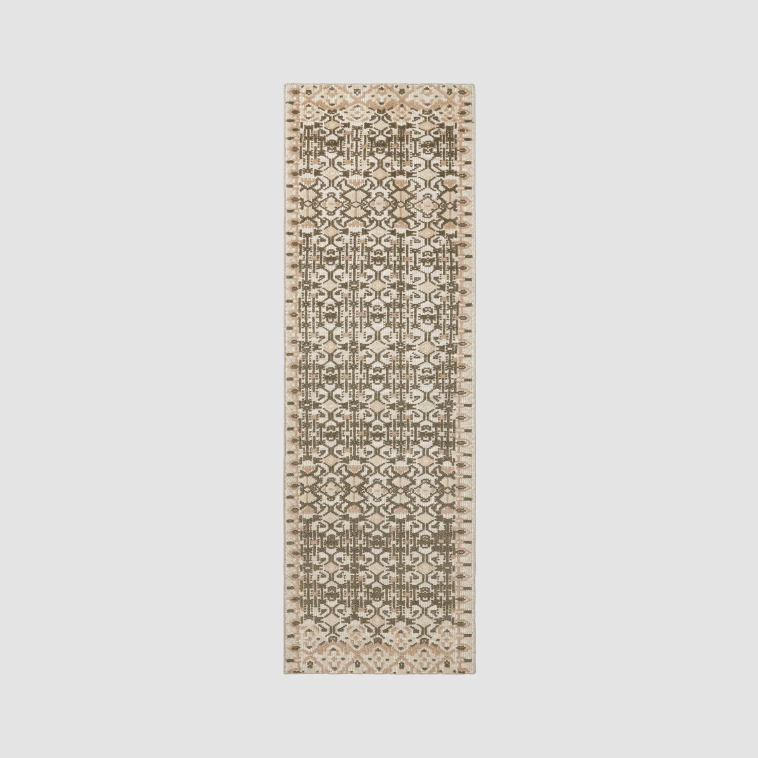 If you’ve ever strolled through a textile market in India, you’ll recognize the rich medallions and detailed repeating motifs on this hand-knotted accent rug. Set against a thriving, earthy green backdrop of wool, each piece is accented by a pair of ornamental borders on either side. Style as the final flourish for your dining or guest room.