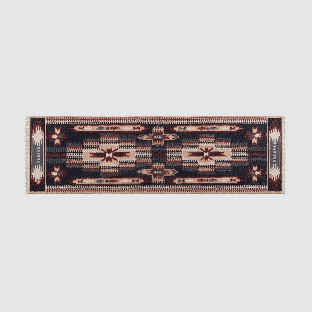 Traditional Indian motifs in a rich palette of navy, blush, maroon, and subtle pops of peach, this show-stopping runner is a work of art. Meticulously handwoven from the highest quality sheep’s wool, this woven masterpiece is as durable as it is stunning.