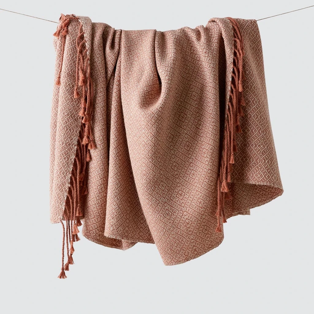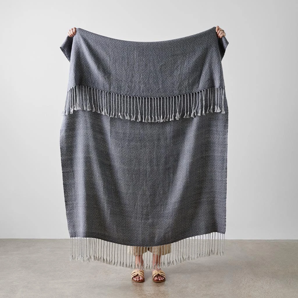 It’s not an optical illusion. This beautiful throw has diamonds inside of diamonds, creating a delicate, all-over pattern that’s the result of a typical weaving pattern from Peru. Accented by a soft, hand-twisted fringe, each piece is available year-round for a cozy couch session.