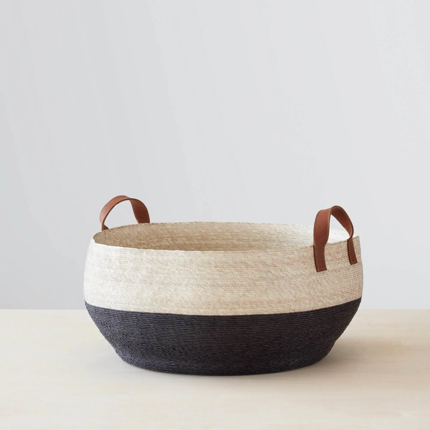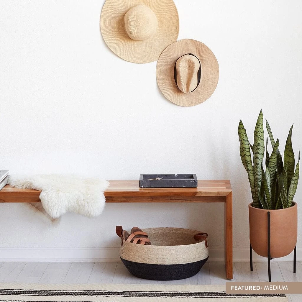 Meticulously handcrafted from locally-sourced palm leaves and accented with luxe leather handles, this set of low-profile baskets make stashing clutter look good. Designed in a shallow, yet roomy size, these baskets are perfect for storing books, towels, or shoes. And bonus – their short stature makes them easy to slide under your bed or coffee table.