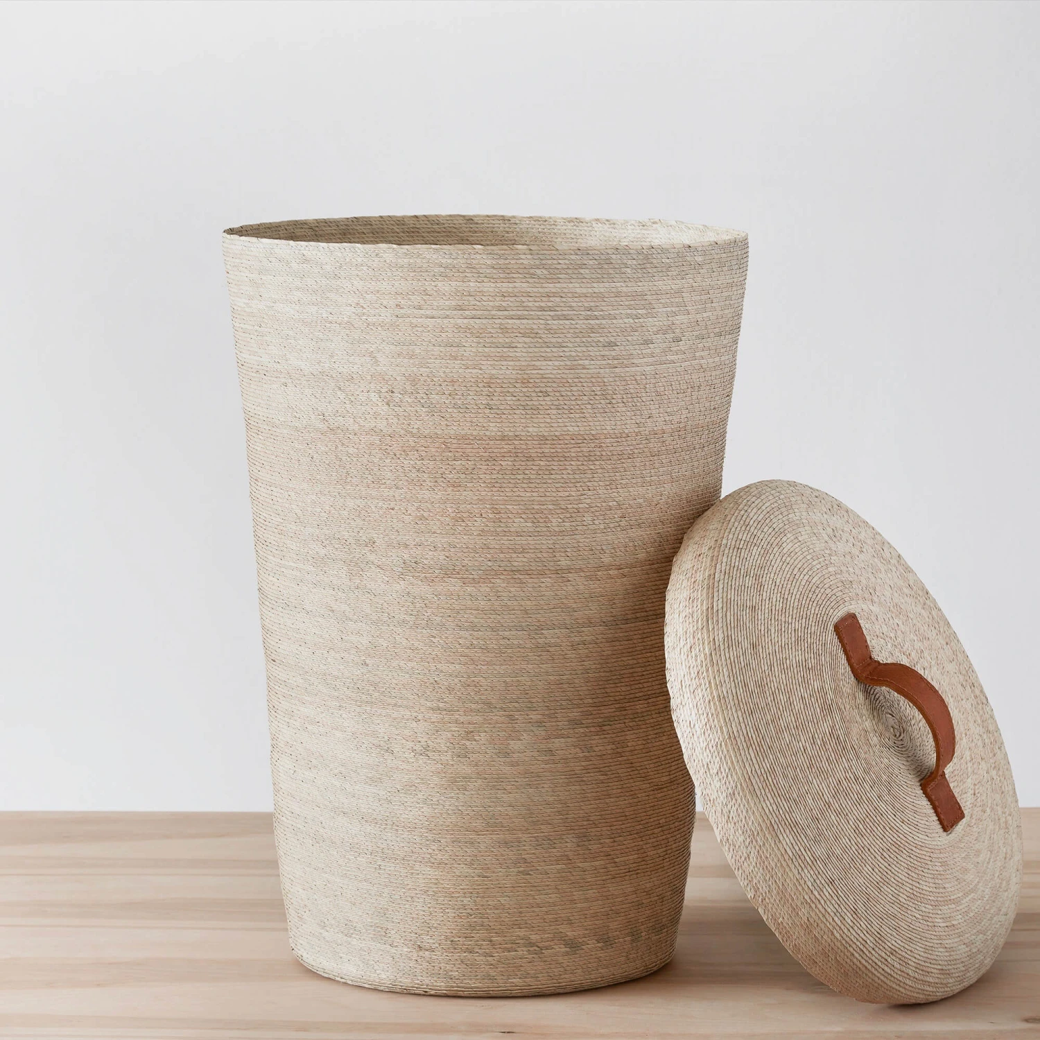 Meticulously handcrafted from locally-sourced palm leaves, this oversized storage basket is the ideal stash-everything catch-all. Topped with a fitted lid and luxe leather handle, it makes a stylish hiding spot for all sorts of clutter – laundry, towels, toys, you name it.