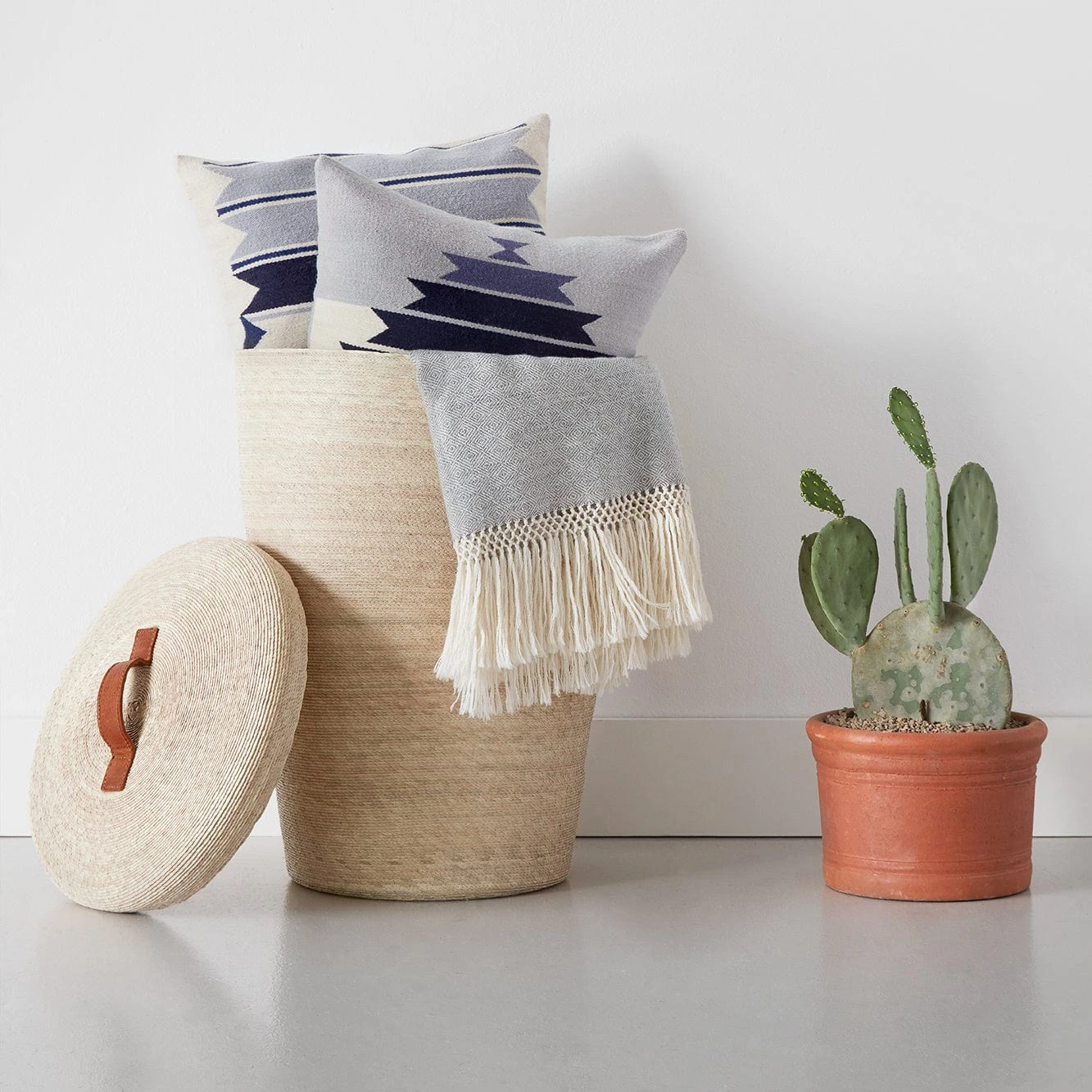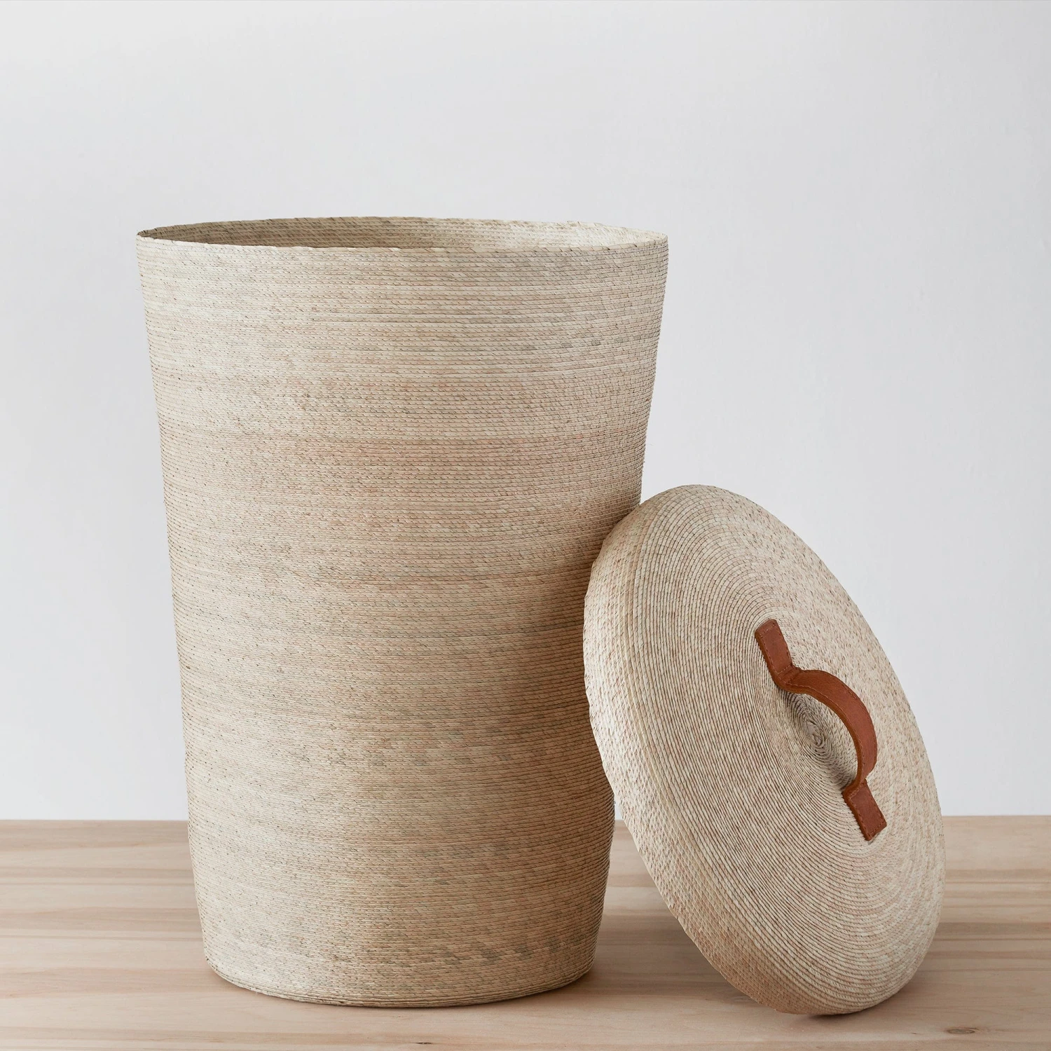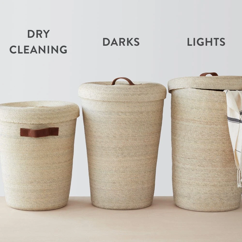 Meticulously handcrafted from lightweight, yet durable palm leaves and finished with luxe leather handles, this set of three hampers makes stashing laundry look good. Complete with two large hampers – one for darks, one for lights – and one medium hamper for dry cleaning (see side handles for easy toting), this set has you covered.