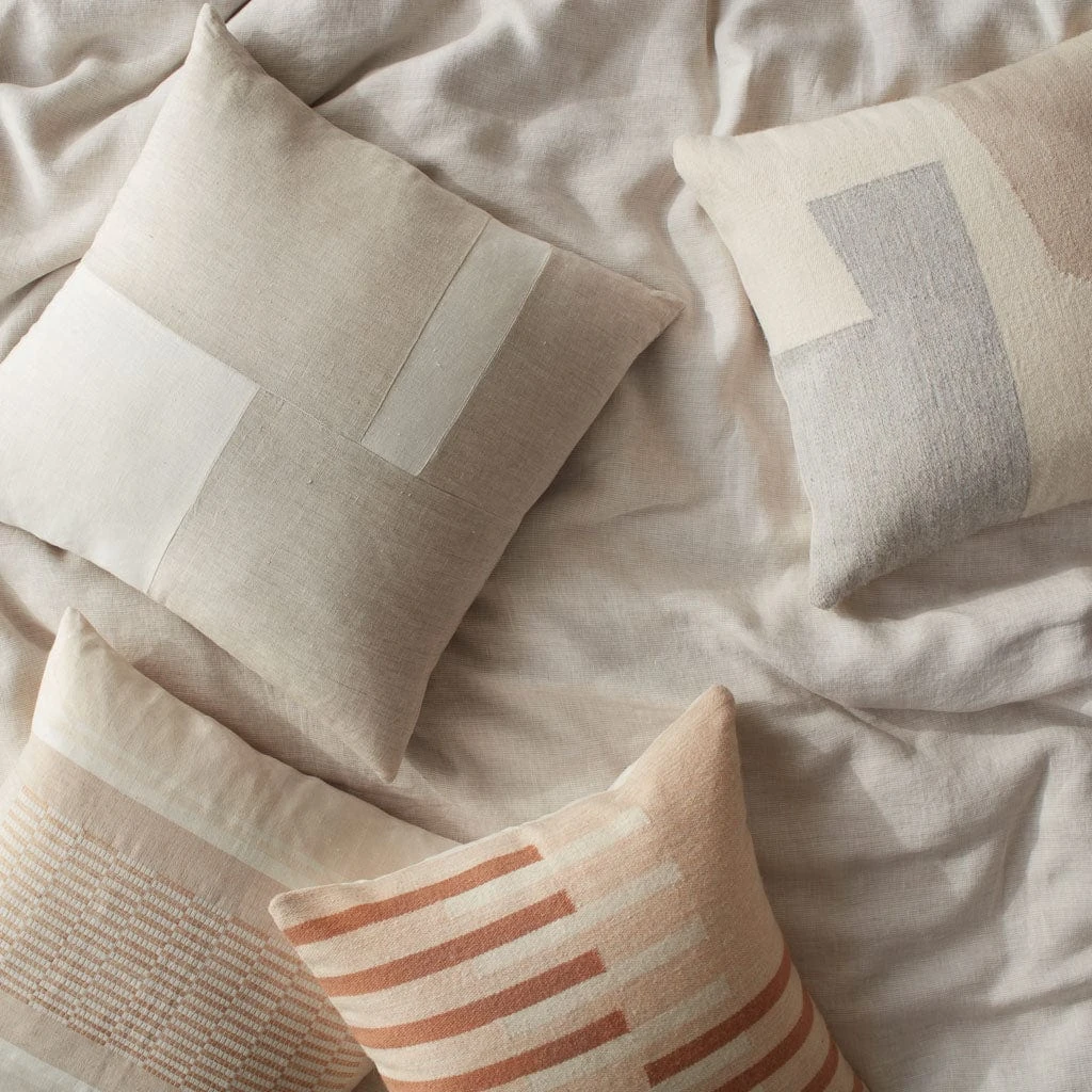 Every styling situation craves a good anchor. Well, look no further. This beautiful linen pillow works perfectly on a couch or in lieu of traditional Euro pillows on a bed. It’s simple and neutral but with quite a bit of interest – with striking color blocking balanced by a soft, neutral color combo.