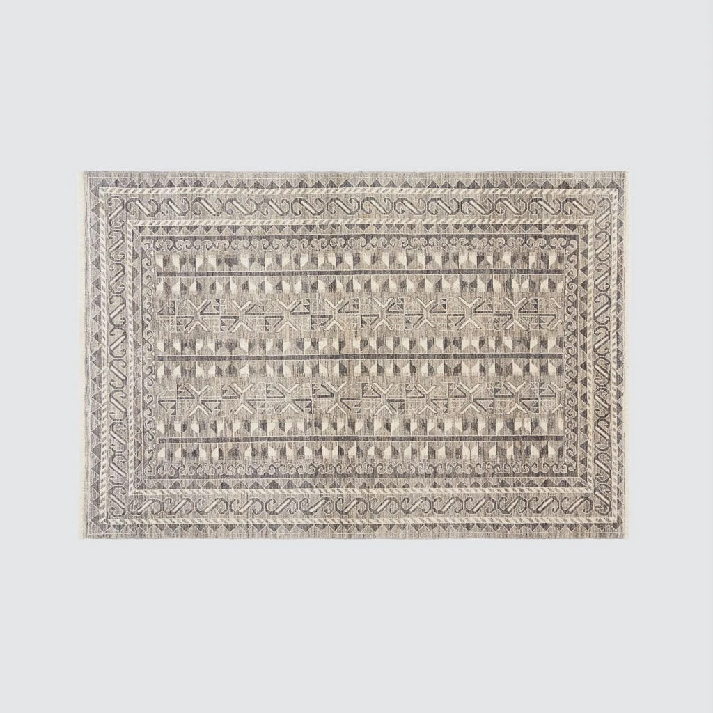 Simplicity is never short on style. Layers of craftsmanship are knotted by hand into this beautiful Afghan rug. A rich blend of geometric shapes, each rug features eye-catching patterns of arrows and triangles. Available in a natural shade of charcoal, this rug is a minimal masterpiece.