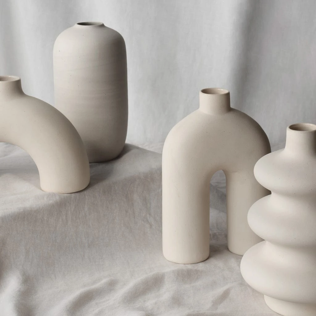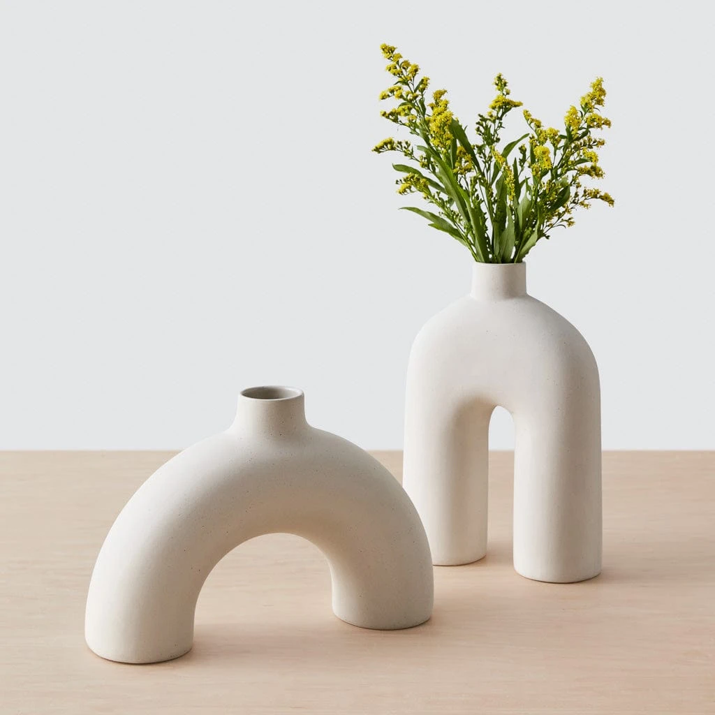 A sculptural piece that shines in any space, this ceramic vase forms a stunning arch with a slightly-textured white matte finish. A natural addition to your side table or shelves, this vase can be styled solo or as a set.